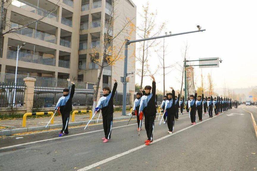 在市直七校外主路上,800余名延鲁学子列阵以待。他们身着统一校服,身姿挺拔,目光如炬。随着嘉宾抵达,现场瞬间沸腾。刀术迅猛、长枪翻飞、短棍凌厉,十八般兵器同时挥洒,令人眼花缭乱。学员们精神抖擞,挥拳、踢腿之间,攻势如潮,守势如山,动作干净利落,尽显刚劲威武。力量与技艺交织,激情与拼搏共鸣,交织成一幅力与美的动人画卷。